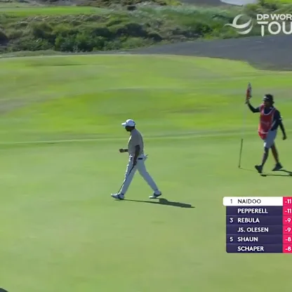 South African Dylan Naidoo goes birdie, birdie to rejoin the lead after this birdie at the 6th hole in Mauritius.