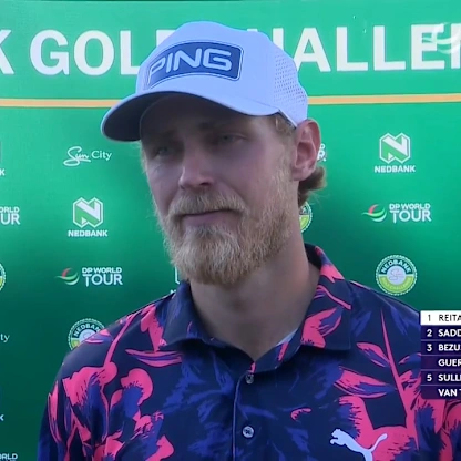 Kristoffer Reitan reacts after shooting 69 in his second round to lead the 2026 Nedbank Golf Challenge in honour of Gary Player.
