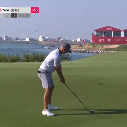 Paul Waring birdies the par-three 17th to regain the solo lead at 23 under in the final round of the Abu Dhabi HSBC Championship.